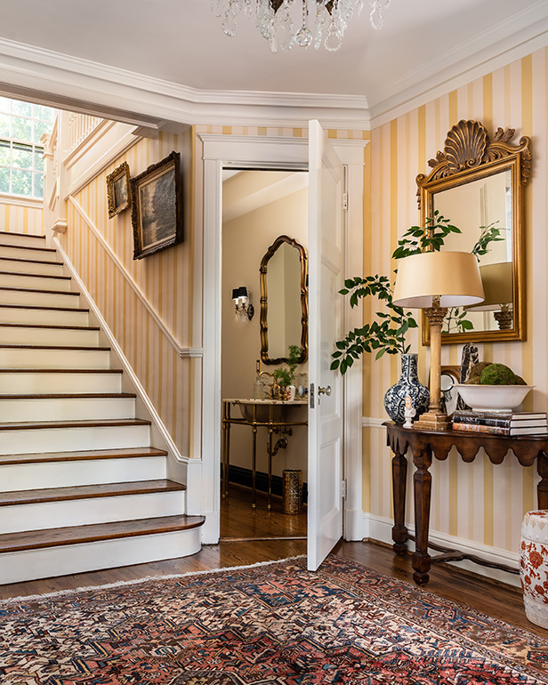 Luxurious touches that radiate an authentic traditional vibe include the living room’s Century chocolate brown velvet sofa trimmed in silk tassels that Lucy purchased from a dealer in Chicago during one of her buying trips in search of the perfect furnishings. To create a grand entrance, she strategically chose a classic striped Brunschwig & Fils wallpaper to cover the front hallway and main stairwell.