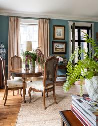 Another essential aspect Lucy considered before the renovation was the home’s highly sought-after location. The dwelling is ideally situated overlooking the scenic neighborhood of Forest Park, which greatly influenced the interior design. The homeowners are an active young family that enjoys spending time together in the park and the large back yard of their home. Lucy’s color palette draws on the natural elements on display from every window of the house. She selected nature-inspired Benjamin Moore paints for every room to create a seamless flow throughout the home. The creative vision for the living room’s rich color palette was a large pink magnolia tree in the back yard set against a vivid blue sky that reaches peak bloom in the springtime. The bark of the trees surrounding the property inspired the dark brown dining room walls, and the rusty orange fall leaves gave Lucy the idea for the room’s curtains. Hues from the paintings in the homeowners’ art collection helped guide the decorative finishes, such as pillow and furniture fabrics and accessories.