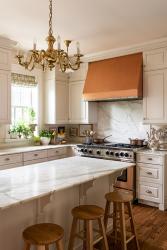 Some of Lucy’s notable selections include a custom powder room sink made with Palmer unlacquered brass legs and topped with marble from the home’s original sink. For continuity, she chose Rohl unlacquered brass plumbing fixtures in both the kitchen and powder room. The lighting throughout the home features predominantly restored antique fixtures purchased from local dealers—Jon Paul Designs and Collectibles and Ronnie Vinton’s Cool Stuff Period. For the kitchen, Lucy custom-designed the unlacquered brass pendant lights from Rejuvenation and the copper range hood. The Blue Star range lends gourmet-quality functionality, and the backsplash and island top are outfitted in elegant Calacutta Oro marble.