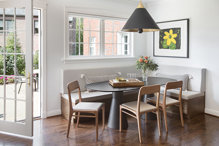 The designers incorporated neutral mid-tones to soften and warm the stark contrast of black and white. At the island, four counter stools are handcrafted from sustainably harvested Brazilian hardwood with faux leather seats for soft lines and easy maintenance for the young family. A custom banquette is built into the space to meet the family’s seating needs and is covered in a light neutral faux leather. The oak table is finished in black to complement the kitchen cabinets and is surrounded by three chairs in a similar style and finish as the island seating.