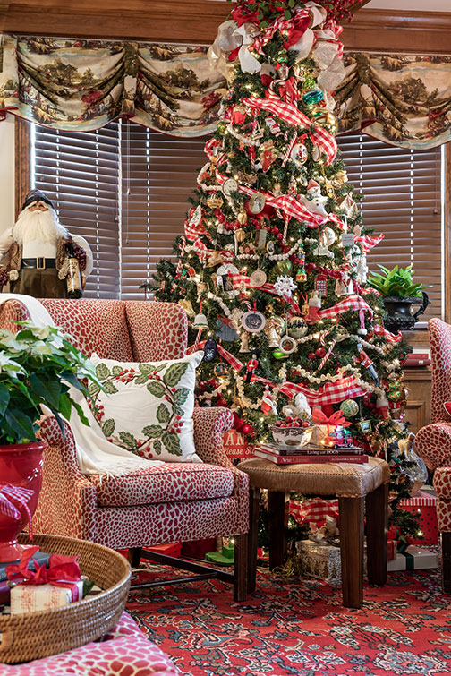 Liz describes her holiday decorating style as cheerful, warm and plentiful. “I want someone to look at the tree and have lots of things to look at,” she says. “I always overdo everything. I can’t be a minimalist.”