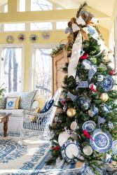 Liz gets creative, coming up with themes for each tree. She lets each room’s purpose and décor determine how it should look during the holidays. Last year when her home was on the Deck the Halls of Glennon Homes Christmas Tour, she created a charming tree in her enclosed sun porch by adorning the tree with real blue and white china plates and tea cups taken directly from her cabinet.