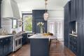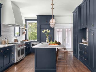 The original kitchen in this 1913 home was secluded from the rest of the house and separated by an unnecessary staircase and bathroom. The goal for the new kitchen design was to feel like it had always been in the home but with modern amenities. The designer, Chelsea Design Company, added symmetry, contrast and function to the 230 square foot space. The client requested a 48-inch Wolf range, a large island, a drink station, multiple modes of refrigeration and a cleaning closet. In order to fit everything the homeowner desired into the space without feeling cluttered, clean lines, contrast and color were incorporated to feel spacious and timeless. The designer centered the range on two existing windows with no wall cabinet and framed out a drywall hood, painted the same color as the walls, to give a floor-to-ceiling ombré effect. Navy cabinets paired with a tonal leathered quartzite countertop and backsplash that fade into the white walls and hood provide contrast. To optimize storage, toe kick drawers store cookie sheets and a floating quartzite shelf with brass rods lends additional space. Hooks for everyday pots, pans and utensils were added to keep the counters free of clutter. The top priority of the project was to modernize the kitchen while still staying true to the style and age of the home. Inset cabinetry references the time period while managing all of the family’s storage needs. The designer continued the full-height cabinetry on to the pantry and incorporated food storage and a hidden cleaning closet with a drink station in the center.
