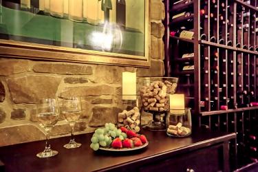 But lighter walls, white cabinetry in the kitchen and other more traditional touches keep the industrial elements from being too hard-edged. The warm cedar of the wine room contrasts with the corrugated metal over the game counter, while the bright apple green accent wall at one end balances the dark-hued, formal wallpaper at the other. That combination of finishes makes the lower level “every bit as much a kids space as it is an adult space,” Wortham explains.