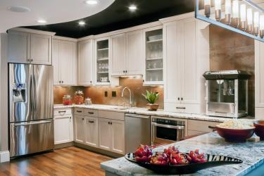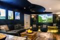 With a palette of blacks, grays and metallics, the basement’s “edgier, almost industrial” look was another departure from the house’s first and second floors, which sport a traditional décor. One of the space’s most distinctive—and contemporary—features, a stepped ceiling with a serpentine edge whose taller sections were painted black, was the result of some creative problem-solving, a way to hide the heating and cooling elements that ran through the center of the basement ceiling. “It was a really creative work-around,” says the homeowner. “The black added drama and depth, and it enables us to have eight-foot six-inch ceilings in much of the space.”