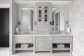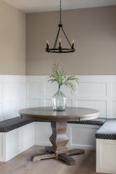 For the adjacent breakfast nook, Gina wanted to mirror the living room’s aesthetic to maintain the same vibe. Here, she installed a decidedly miniature version of the living room chandelier over the pedestal breakfast table surrounded by cozy, built-in banquette seating. White wainscoting encloses the space and creates a sense of warmth and intimacy. “My color scheme is light and airy with accessible beige walls covering most of the home and light French gray in the primary bathroom,” Gina adds.