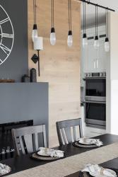 From top to bottom, Gina carefully considered every detail in her home down to the lighting choices, which surprisingly all came from Wayfair. Every fixture is perfectly proportioned and stylishly supplies the jewelry for each room. In the living area, a magnificent circular black wrought-iron chandelier makes the perfect focal point for the grand scale of the space. “The lighting needed to be one of the main features of the room,” says Gina. “I thought it would complement the massive fireplace and the vaulted ceiling.”