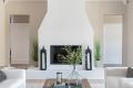 In the kitchen, four clear-glass pendant lights illuminate a white marble-clad island accented with plush, charcoal-gray counter stools. A gray and white herringbone-patterned backsplash behind the stovetop creates visual interest with a compelling element of pattern. Directly behind the kitchen, the dining room features doors leading to a screened-in deck. A long dining table that can seat 10 required a modern touch to complement the contemporary floating fireplace as well as the length of the table. So, Gina added a linear-style chandelier with tiny pendant lights to illuminate the table and installed sleek black and white sconces to flank the fireplace. “I love the separation of the dining room from the rest of the home for a more intimate dining experience with the family,” she notes.