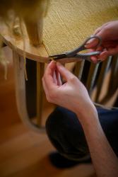 Douglas Dale has been working with yarn for a decade now, but they started using yarn to trace wood grains right around the height of Covid. “It was then that tracing wood with yarn was something rote and repetitive, and it just offered a good Zen activity,” they explain. It was also around the time that they started exploring ideas around gender and what it might mean to be nonbinary. “I really liked the metaphor of covering wood with yarn and making an object designed to encapsulate two different polarities of hard and soft, textile and wood, masculine and feminine.”
