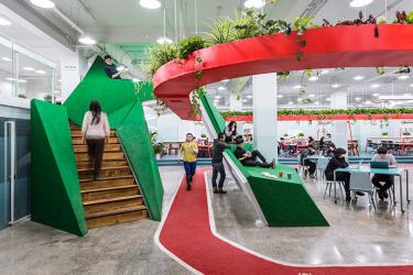 To create an office for “social well-being” as the architects note, they had to find a way to connect the fields of job training, agricultural research, preschool education and microfinance into a cohesive, functional workspace. A central running track with suspended vegetation above ties together each distinct company.
