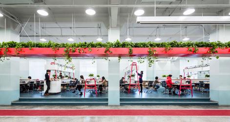 Utilizing indoor plants has been proven to assist mental wellbeing and lessen anxiety or stress; the suspended plant loop also houses an advanced air filtration system to elevate the office’s air quality. Because of Beijing's significant pollution issues, many offices are now employing similar systems to collect indoor air quality and monitor it. Vegetables and aromatic herbs from the activity loop and other hydroponic gardens throughout the office communally harvested and prepared on-site for lunches.