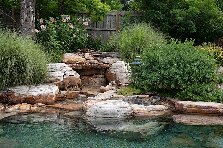 There are layers of terra cotta colors in the sandstone, limestone and granite used to create the swim pond that sparkles with clear, turquoise water. Nearby, goldfish and koi flash red and orange as they glide through the water lily-filled fishpond.
