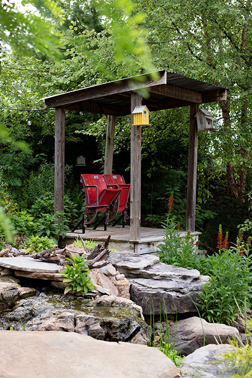 While all these colors can be found in nature, Lori and her wife Gerri Rosen have injected a shot or two of color on their own. Resplendent in a wooden pavilion overlooking the entire garden, two bright red chairs salvaged from the former Busch Stadium offer the best seats in the house. Elsewhere in the garden, Gerri, a huge Cardinal fan, has tucked other Red Bird memorabilia.