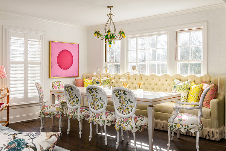 Maggie implemented several special features into the home, including a custom banquette and two vintage Murano lemon chandeliers. In addition, she opted for a custom sofa from Expressions Furniture that is ideal for lounging and placed a vintage settee in the sunroom from Warson Woods Antique Mall that she had reupholstered. Beautiful lacquered pieces from Resplendent Crow decorate the sunroom and both bedrooms upstairs. “We also displayed original artwork and custom rugs throughout for a signature look,” notes Maggie.