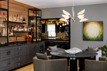 In harmony with the kitchen, walnut and black oak cover the lower bar cabinetry in the dining room and showcase Peg’s eye for texture. What was previously a rarely used traditional dining room has become the perfect bar/lounge to host friends and family. To accommodate the dining room’s barrel chairs, the designer personally designed an extension table that transforms from a 60” diameter to a 120” oval. Along with the new table, Peg replaced their previous dry bar for a redesigned wet bar. This update allowed the homeowner to see each liquor bottle and have all of her necessary bartending materials at her fingertips. The space was completely transformed to host all parties, small or large.