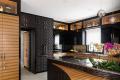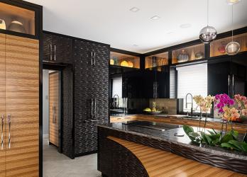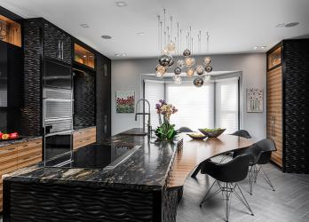 For the kitchen, Hammerschmidt went for a dramatic finish with bold wood and texture selections. The countertops boast a natural granite in gray, sprinkled with gold veining and completed in a suede finish. On the cabinetry, strips of alternating light and dark wood pieces meet to offer visual interest. “Zebrawood veneer grain runs horizontally on the working side of the island, the lower base cabinetry and the tabletop portion,” says Laurie Fromm, president of Classic Woodworking, Inc. It was Classic Woodworking’s expert craftsmanship, talent and willingness to take any challenge Peg threw at them that helped bring the project to life.