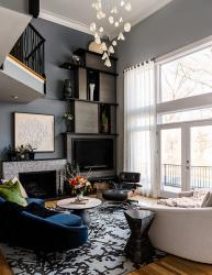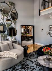The designer had quite the job before her. The living room, according to Peg, was vertically challenged. “The homeowner wanted a living wall in the living room, but the space’s tall walls are a little too high.” To balance out the walls’ height and help viewers’ eyes trail upward, the designer instead installed a gallery wall of mirrors with pops of faux flowers and greenery. “With these additions, your eyes then dance around the room.” To add depth to the room’s empty space, the entertainment center on the opposite wall was built to nearly touch the ceiling and hold the homeowner’s art collection.