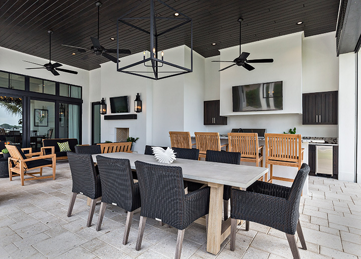 2. By Joy R. Dabill Interior Design. The lanai was designed for entertaining. Groups can gather by the outdoor kitchen to watch sports games, sit at the dining table for meals or by the fireplace to relax. Sliders open to the house so the lanai is an extension of the interior. Roll-down screens protect from bugs, sun and bad weather to help maximize the comfort.