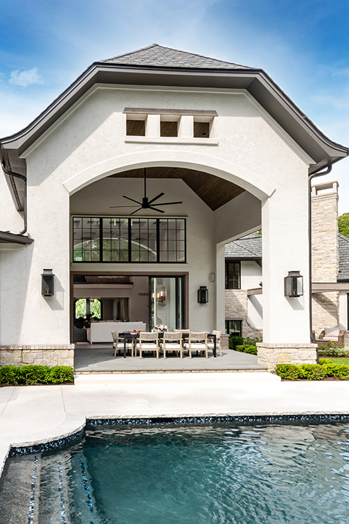 6. By Tegethoff Homes. This beautiful outdoor space is a seamless extension of the main house. Located directly off the home’s expansive great room and adjacent to the kitchen, the space is connected by a wall of sliding glass doors that can be fully opened to connect the indoor and outdoor spaces. It offers a convenient and gorgeous spot for outdoor dining and entertaining.
