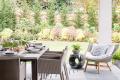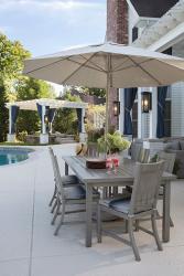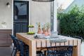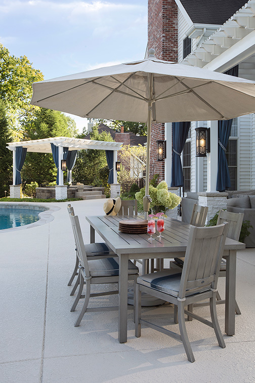 8. By Youtopia Designs. An outdoor umbrella helps keep everyone cool and comfortable. Always opt for high quality furniture that is rust proof so it will stand the test of time. To create an eye-catching and timeless look for your outdoor dining table make sure to add items with varying heights and pops of colors to the table such as fresh flowers from your garden and classic striped chair cushions that coordinate with the surrounding furniture and outdoor area.
