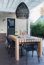 10. By Kukk Architecture & Design, P.A., Gardenbleu and Easterly Building Company. Outdoor entertaining is a big part of Southwest Florida living, so the homeowners wanted a space with beach glamour. The pergola allows for a little sun protection and was designed in an abstract way to be reminiscent of crab baskets with filtered sunlight and blue sky. The hanging light fixture adds to the long linear space. The designer chose real wood detailing with an aluminum structure.