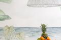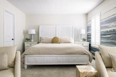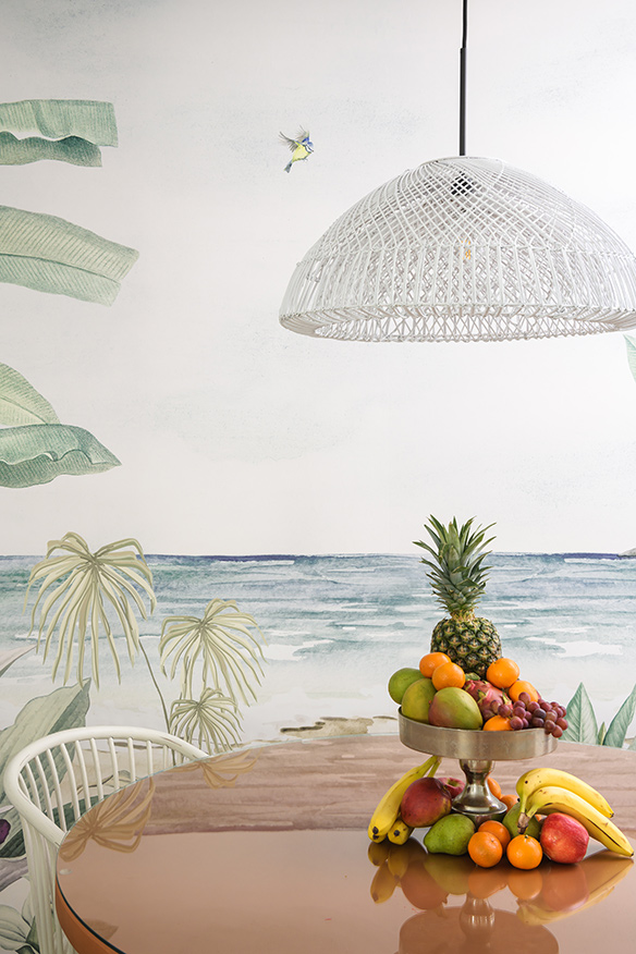 “But to me the primary bedroom is the epitome of a resort,” Moore says. “The woven wallpaper looks like waves paired against misty sky.” Easy chairs sit nearby, and a giant pendant lamp hangs overhead, resembling a jellyfish or floppy beach umbrella. And then there’s the breakfast nook. “We added a tropical mural to one wall so now it feels like you are eating on a terrace overlooking the ocean.”