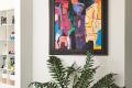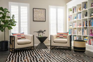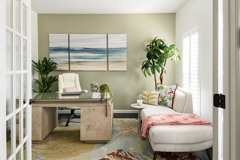 She leaned tropical with vibrant hues and gentle allusions to the tropics. “They wanted more Caribbean or British West Indies as opposed to Polynesian or Hawaiian,” explains Moore. The couple also wanted to honor their African and Egyptian heritages with professional art by artists from those regions. “So, I found a wonderful Egyptian artist who created the pieces in the front entry, library and living room.”