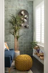 Another means of relaxation is a former walk-in closet. “Behind the door seen in the workout room is the meditation room,” Moore says. Perhaps the biggest change in this room was making it feel cozy. Moore added in vibrant green tile to one wall, so the space didn’t feel like a closet anymore. A fountain hangs on the wall with shelves made with live-edge wood. Here perch florals, crystals and succulents that boost a feeling of tranquility.