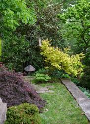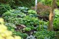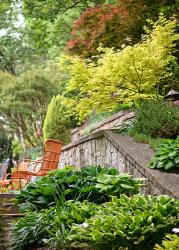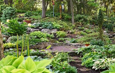 The back yard of their new home, which covered a shady hillside, offered the perfect location to relocate their rooted friends. But it wasn’t easy. The rocky ground made digging a challenge. But rather than discarding the rocks they encountered, Phyllis and Jim saved them and incorporated them into garden beds. Little by little they claimed the ground and added retaining walls and pathway platforms where necessary.