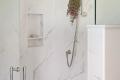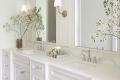 The homeowner desired lots of natural light in a timeless design. Accent on Cabinets and Jeffrey Homes took on the challenge to make sure all the elements of a luxury bath were part of the design while keeping the size modest. A galley bath layout was chosen to give the homeowners their wish to have a large shower and a soaking tub separate from the vanity. Using the same wood floor in the bathroom but setting it in a herringbone fashion adds a classic and elegant detail. The wood floor is also water resistant making it a unique choice for the bathroom.