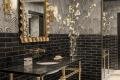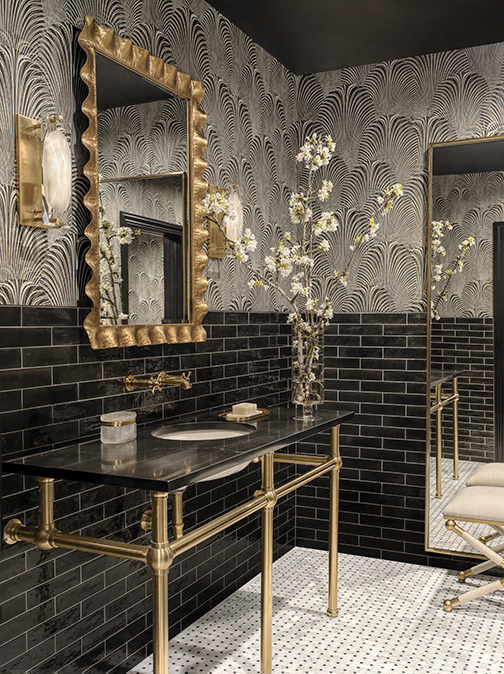 Castle Design paid homage to the golden days of Hollywood in this glamorous powder room. A beautiful marble basketweave mosaic floor is complemented by black textured wall tiles and topped with a deco-inspired wallcovering. The elegant brass sink console is a centerpiece worthy of everyone’s attention. A striking brass floor length mirror reflects the dramatic space. The vanity mirror features a hand-forged metal frame finished in a lightly antiqued gold leaf. The scalloped edge design of the mirror is a focal point adding depth to the space. Brass accents, like the wall-mounted faucet, pair beautifully with the gold legs of the sink console. Visual Comfort sconces have a soft brass finish and clear textured glass putting the finishing touches on the sophisticated powder room.