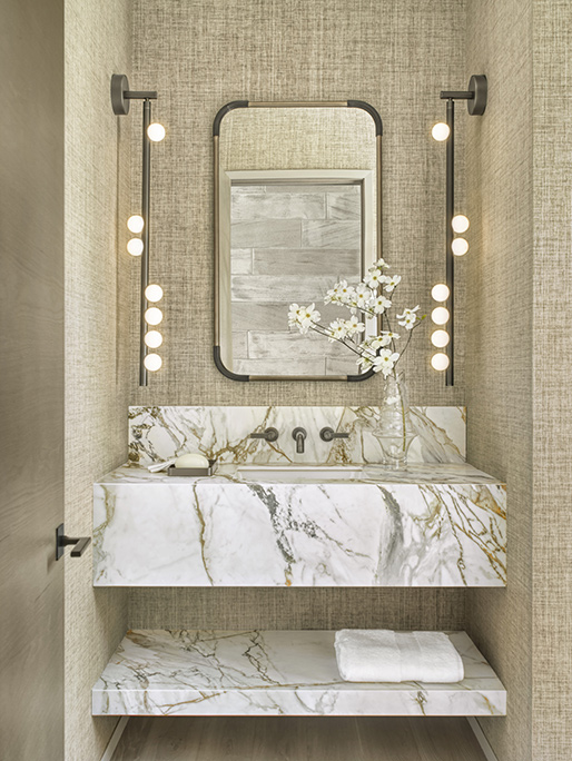 The homeowners desired a powder room design that would “wow” guests and make them feel special. Castle Design layered neutral elements to keep with the understated color palette throughout the rest of the room. The “Drop System” sconces by Lindsay Adelman Studio add a bold statement and a little fun and whimsy. The dramatic gray and gold veins of the Neolith Calacatta Luxe Sintered stone material elevates the neutral-colored room and marries the finishes of the fixtures. An undermount white sink features a wall-mount faucet in brushed bronze. The aged brass and antique bronze mirror is the perfect mix of metals to complement the scheme, and the rounded edges offer curvilinearity to soften the space. The entire powder room is covered in a Phillip Jeffries Japanese paper weave giving warmth and texture.