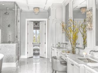 The goal for designer ADJ Interiors was to create a bathroom as glam and stunning as the homeowner herself. The starting point for the design was the Carrara marble floor tile and coordinating mosaic that the designer used to wrap the inside and outside of the large shower. The custom vanities by Centorbi Cabinetry are topped with shaped Carrara marble countertops and backsplashes using moldings to accentuate the mirrors and ceiling details. Flush mount ceiling fixtures on either end of the long, narrow space complement the large crystal chandeliers in the dressing rooms off of the bathroom. Polished nickel is carried throughout the space, including in the show-stopping tub and crystal sconces as well as a powered Roman shade in a silver shimmery fabric installed by Fusion Media Systems, who also installed lighting control throughout the bath.