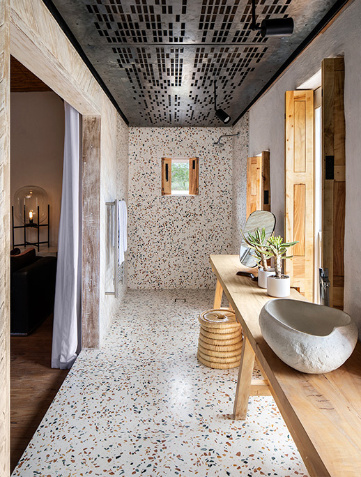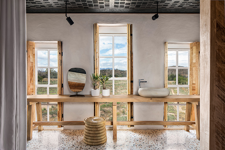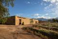 A new build constructed on the site, the pump house was created due to the need for an irrigation building on the property. Differing from its colorful counterpart, the pump house reflects the landscape of the property with its earth-colored walls. Built with materials found on the site, the architects used more primitive working methods to construct the building. Creating mud walls more than a meter thick, the unpainted structure allows the material to shine and takes inspiration from the buildings already constructed on the site.