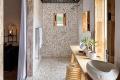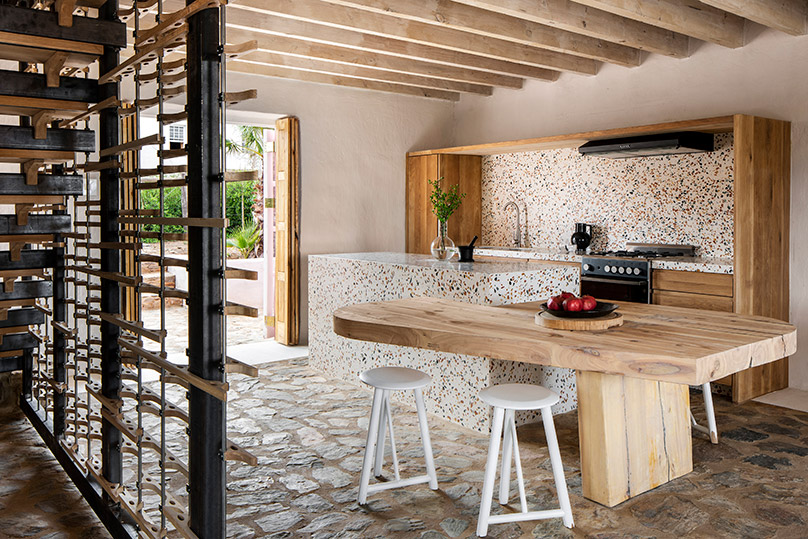 As the area around the property evolved, so did the buildings. In their original construction, the buildings were formed using walls of poured mud or clay - a common practice used by Dutch settlers in the area. Clay sourced from the ground would be combined with sand and grit to ensure the mud was stiff enough to hold its shape. During their restoration, the builders chose to use a thin lime plaster on the interior walls to both “express the original texture of the mud wall” and to leave “a little of that construction history visible.” New additions such as a stone swimming pool, recessed lighting and updated landscaping helped add modern elements to the space.