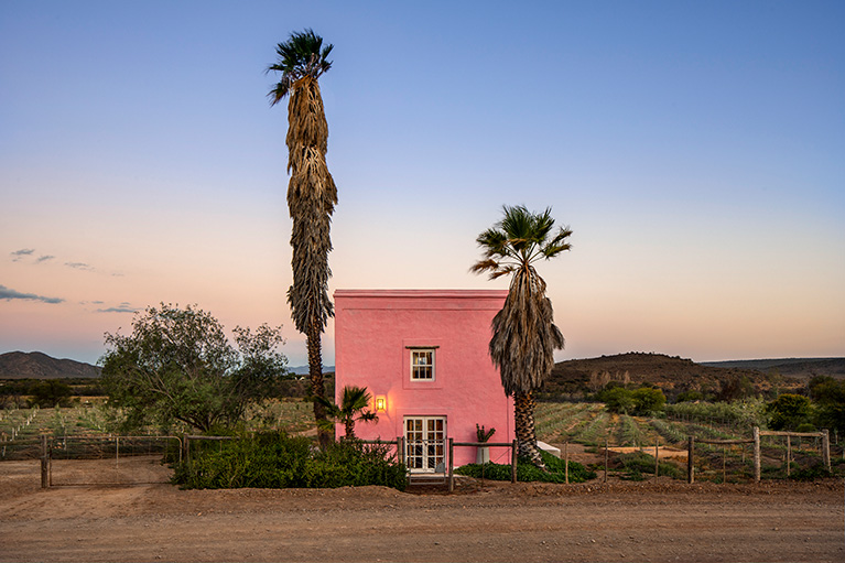 The wine store is a small flat-roofed building given the name in reference to the olive farming that once took place on the farm. The building itself was renovated to create a living space comprised of a living area, kitchen, bedroom and adjacent bathroom. The exterior of the building was painted pink in an exploration of the architect's trips to Mexico. On his travels, he noticed the historical connections between Cape and Mexican architecture and was interested in how he could showcase the similarities between the two. Due to the similar climates between the two locations, bright colors were common in both styles of architecture.