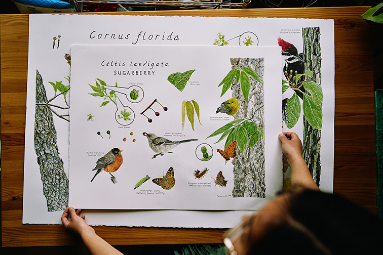 Hu also finds science in art. “I started painting at the beginning of my conservation career to quickly learn plants,” she explains. “It was a great way to spend time observing leaves, stems, flower parts, colors and shapes, helping me memorize what they look like.” The more time she focused on Midwestern plants and ecosystems, the more she realized the rich relationships between all the living organisms in our back yards. “Any time I walk outside, I don’t just see green,” she says. “I see individual plants and the complicated relationships occurring around them.”