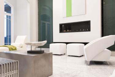 Opposite the seating area, a wall-length black river rock waterfall borders a rectangular fireplace resulting in a unique fire and water combination. Not only is the wall the showpiece of the room, it is also beneficial to the home. The water wall humidifies the home and cleans the air by pulling the dust out. As dust and dirt are sucked into the water, the water filters through a purification system and redistributes back down the wall. Functional and bold, the wall makes a statement in the otherwise sleek room.