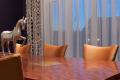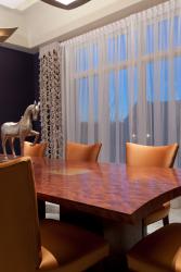 Draped in an exotic wood veneer, Kewazinga, the dining table slightly curves at the ends to follow the curve of the light fixtures above. The uplight of the fixtures provide a warm glow to the room. A luminous microbead wall treatment was applied to ceiling to catch the light from the fixtures. A matching serving piece, also by Centorbi, placed behind the dining table allows for easy access when entertaining guests. Laser cut sheers let in natural light from the front of the home.