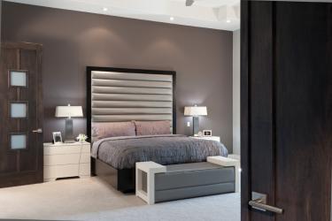 Just across the hallway from the master bedroom, the homeowners can easily slip in and out of the study late at night or early in the morning. Tranquil and cool with clean lines, the master bedroom is the perfect escape for the hardworking homeowners. An oversized mahogany and silver upholstered bed frame by Centorbi makes a bold statement in the otherwise serene room. Off-white nightstands and bench enhance the minky gray walls, which give off light hints of purple.