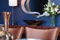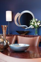 Rich eggplant walls greet you as you enter the dining room. Selected for its versatility, the color adds depth to the space and pairs well with satin copper dining chairs placed around the custom-built 12-foot dining table, with glass inserts, built by Centorbi Custom Cabinetry. “The copper adds a pop of color, but it is different than what you would expect,” says the homeowner.