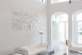 A set of three spherical stainless steel fixtures fills the vast ceiling in the home's great room. Open and pristine, the room conveys the stark simplicity felt throughout the home. Floor-to-ceiling windows and second-story glass panel half walls allow natural light to spill in to the space. Sleek white furniture contrasts with stainless accent tables creating a swank place to entertain guests. Although lacking in color, varying textures from the leather and fabric on the furniture, metal of the tables and glass in the walkway panels generate interest without over ornamentation.