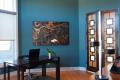 With plenty of family space in the home, there are also many private areas for each family member. A study for both homeowners continues the modern look throughout the home while maintaining a professional atmosphere. Mediterranean blue walls give the study a darker, but not traditional, feel. Bamboo flooring softens the room and is a nice contrast against the darker wall color.