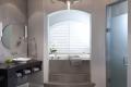 The gray theme of the master carries into the master bath, which the homeowner designed to resemble an ancient Greek spa. A plaster textured faux finish on the walls gives the appearance of stone. Minimal cabinetry, in maple with a mink-gray finish, reduces clutter keeping the space clean and sleek.