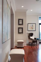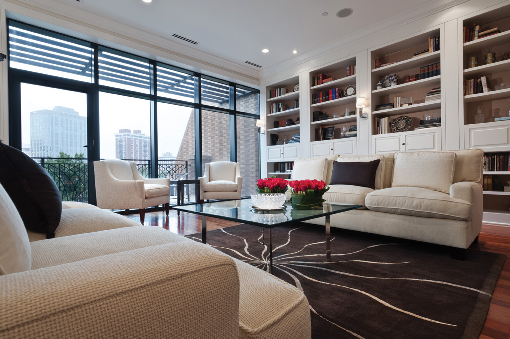 Drawing on his vast knowledge of construction, materials, products and fabrics, Salinas proceeded to demonstrate his ingenuity. Since floor-to-ceiling window walls and sheltered terraces span much of the residence, he made the decision to blur the distinction between the building’s Deco-inspired architecture and the home’s interior. The exterior limestone and brick colors were repeated in various areas – for example, the living room’s custom-made Beauharnais limestone fireplace, and numerous black accents, including several interior doors, reflect the terraces’ wrought-iron railings.