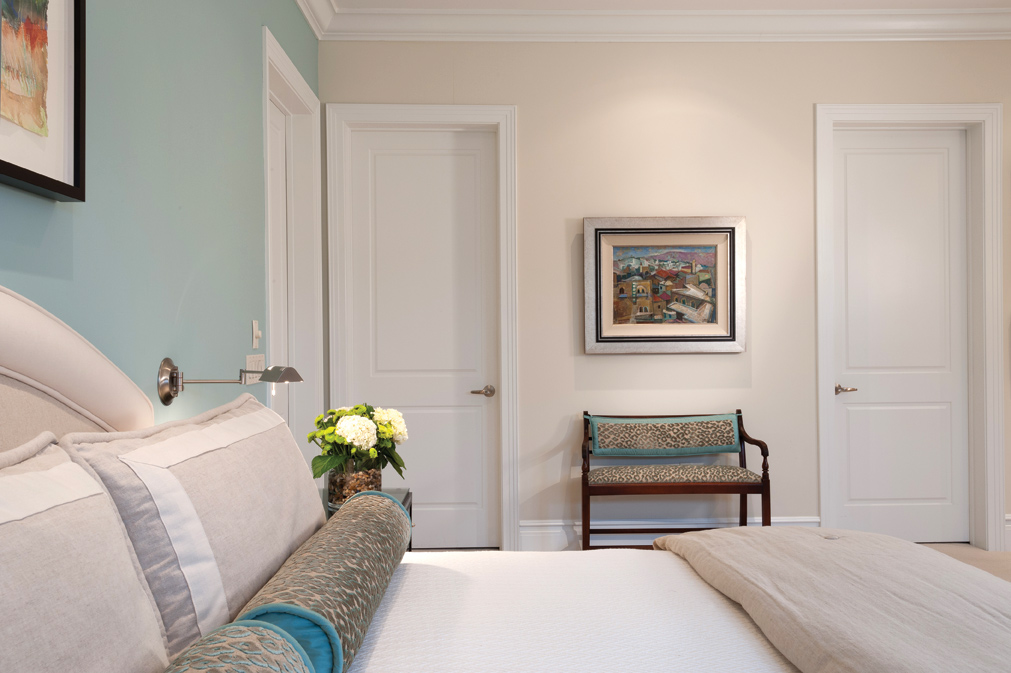 A delicate blue accent wall and white cabinetry with sandblasted glass panels offset the dark wood furniture of the master bedroom, which Salinas describes as “a great example of punching up what the owners already had.” Unifying the color scheme and reinforcing the room’s fresh, tranquil ambience, he chose a sculptured silk-&-cotton Thibaut fabric for various upholstered items. The master bath continues the sophisticated theme with limestone flooring, granite countertops, a glass shower enclosure, Grohe fixtures, and a floating Robern cabinet.