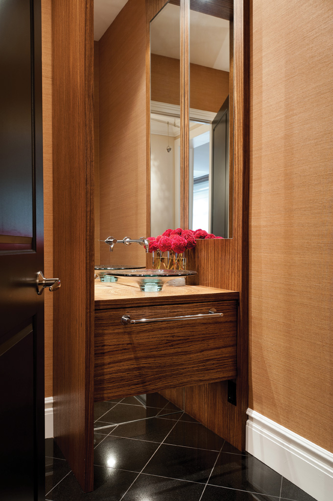 Other noteworthy, high-fashion details include a mirrored zebra wood tower in the powder room and washable linen walls in the hall leading to the guest suite and colorful bedroom designated for the owners’ granddaughters.