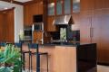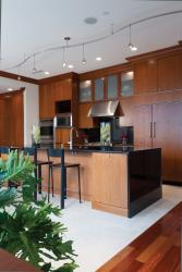 A contemporary masterpiece, the kitchen showcases gleaming matched cherry cabinetry with sandblasted glass inserts, limestone-colored porcelain floor tile, brushed stainless appliances, black granite blanketing the countertops, backsplash, and massive breakfast bar/prep island, a built-in wine cooler and freeform German tech lights. For additional storage, cabinetry is built into the breakfast bar’s kick space.