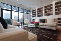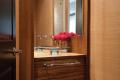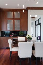 Establishing a sense of comfort and familiarity, much of the furniture from the owners’ previous home was incorporated into the overall plan, and the wife’s one stipulation was a “white” living room. Complying with her request, Salinas lined the walls with full-height white display shelving, enhancement-lit and backed with bourbon-toned grass cloth.