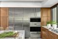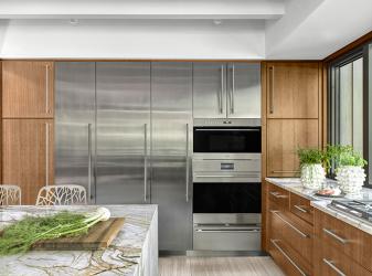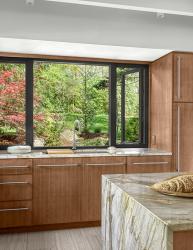 A dark, lonely kitchen unchanged for 40 years lacked natural light and connectivity. With the goal to revitalize the dated space working with limited square footage and the necessity to retain existing soffits and exposed ceiling beams, designers Alspaugh Kitchen + Bath and Castle Design transformed the kitchen design. To maximize the sense of space, the designers focused on blurring the boundary between the kitchen and its surrounding spaces. A U-shaped plan with an island for seating was the ideal solution. Custom-sized windows run cabinet to cabinet and from counter to soffit allowing for minimal trim and maximal glass area. Creating another opening to the dining room allows for seamless flow around the island enhancing the overall functionality of the kitchen. Straight grain cherry veneer was selected for the cabinetry to complement the other wood finishes in the home. The cabinetry is enhanced by the Blue Tempest quartzite countertops. The reflective stainless-steel wall amplifies the sense of light and spaciousness. Pop-up counter outlets flank the cooktop and eliminate the need for a traditional backsplash. The cabinets are fully accessorized with lift doors and pull-out shelves making for an organized space. This highly functional kitchen serves as the gathering point in the home with stunning views of the outdoors and an inviting atmosphere.